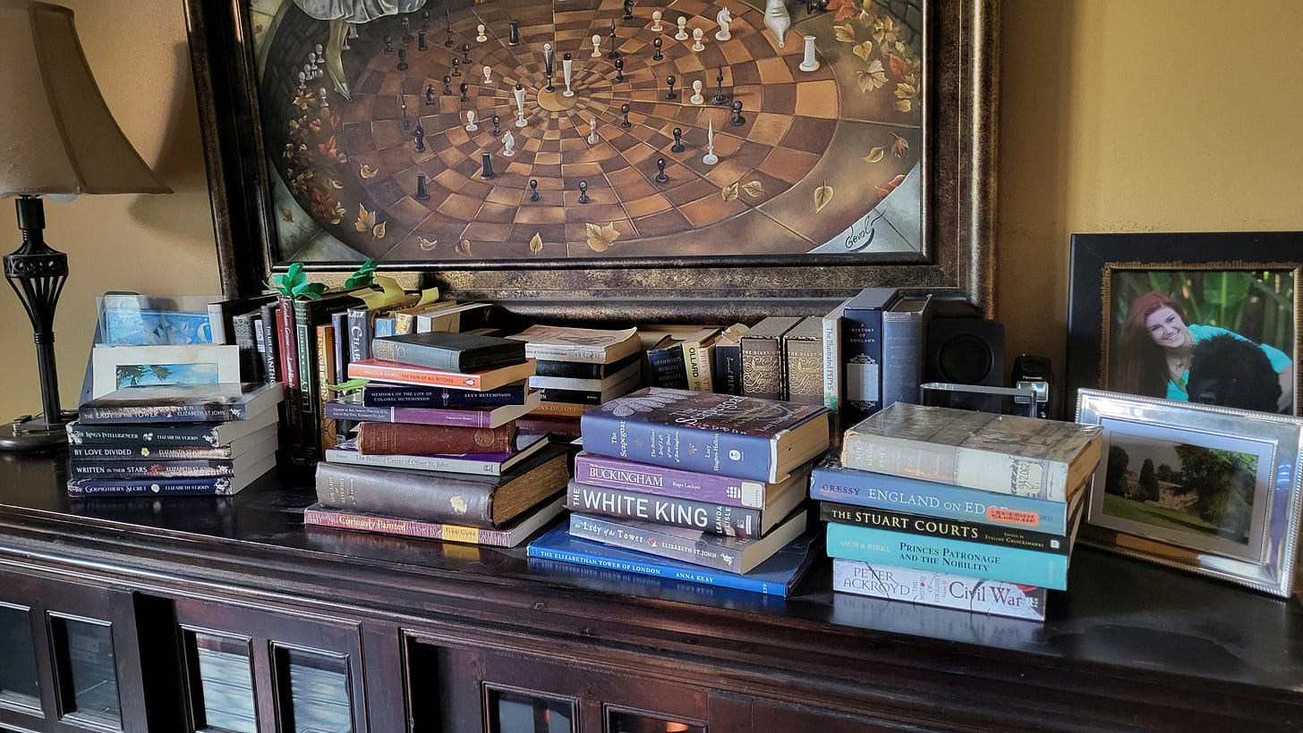 Going a step further, I decided to approach my research from two perspectives. The first was immersive. I read any fiction and non-fiction book that caught my eye and seemed relevant to the period. I was fairly widely read in the preceding sixteenth century, but most of the action in The Lady of the Tower takes place in the seventeenth century. I needed to brush up on my Stuarts. This involved a voracious consumption of the driest textbooks (try Divine Right and Democracy: An Anthology of Political Writing in Stuart England for an evening of light reading) alongside the wonderful biographies of Antonia Fraser, Anne Somerset, Paul Sellin, and Roger Lockyer. I decided early on not to read too much fiction set in this time: I wanted to develop my own voice, clearly state my own interpretation of those times. Well, OK, guilty pleasure - who could resist reading Forever Amber again (probably the first time since a teenager) in the name of research!